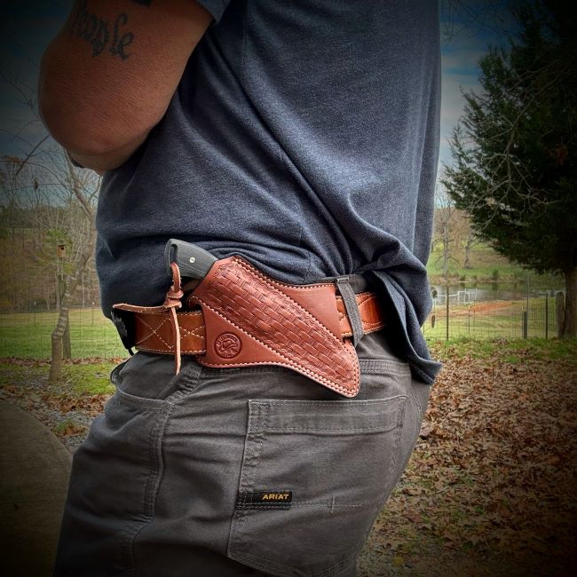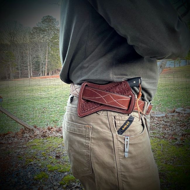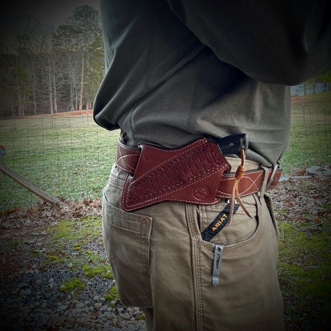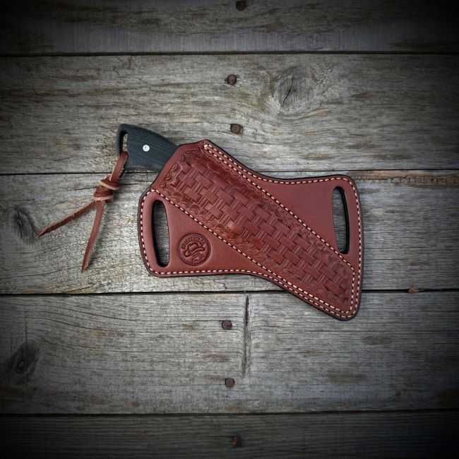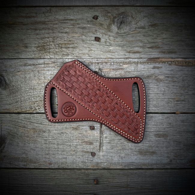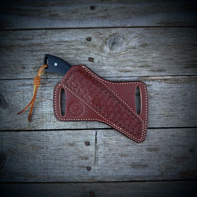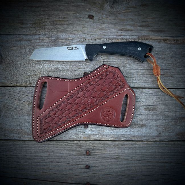 Horizontal sheath for the Stockyard knife from Montana Knife Company. The sheath that you get will not have the MKC logo on it. I have seen sheaths that have been cut through and stitches cut. These knives are very sharp and you have to be patience when you reholster you knives, It takes a will to create that natural pocket for it to rest in. I will not replace for holes or cut threads. The color is Medium Brown