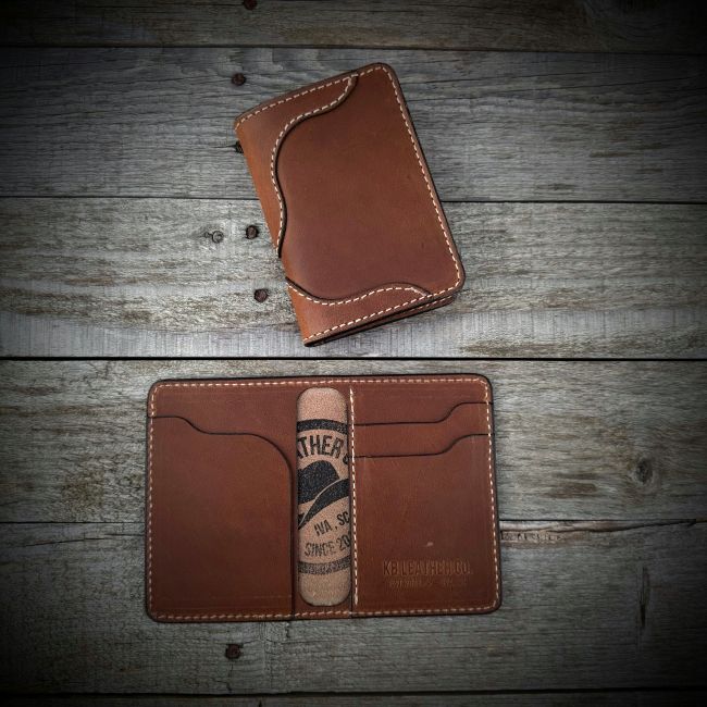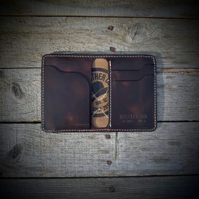 This is the Rancher 2 Vertical Wallet bi-fold multi pocket wallet is uniquely configured to give you maximum storage while keeping a small and slim profile. It is slightly bigger than Drifter Vertical and still has a cash flap pocket on the left side. It will carry comfortably in the front pocket or the back pocket.   It is one of my most popular wallets at the moment. It measures 3-1/2 x 4-3/4.