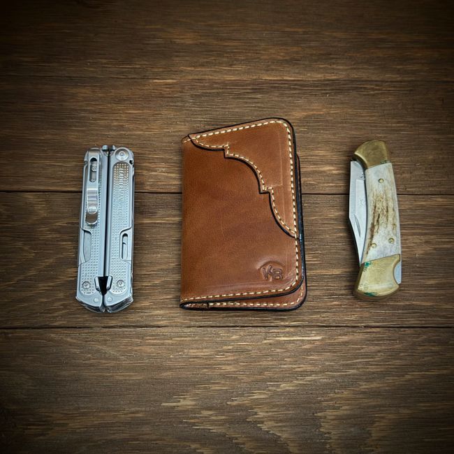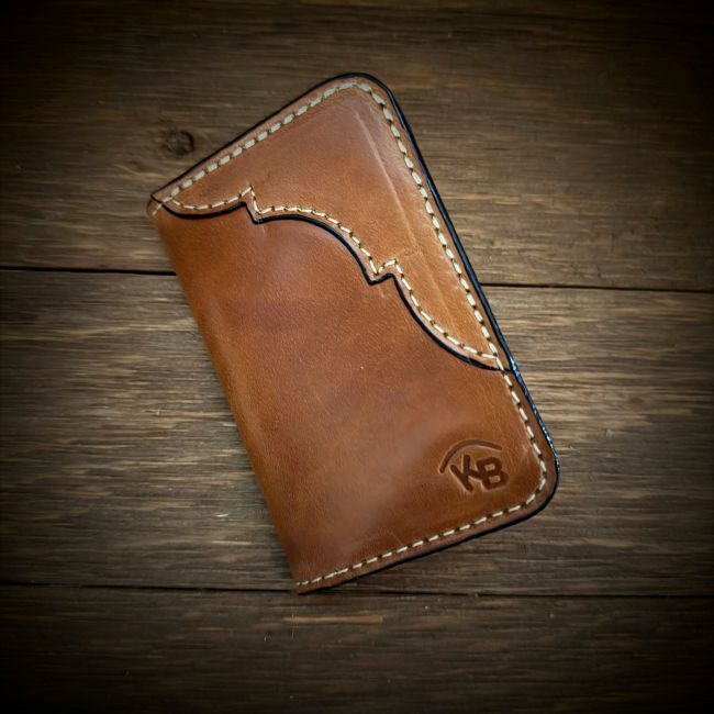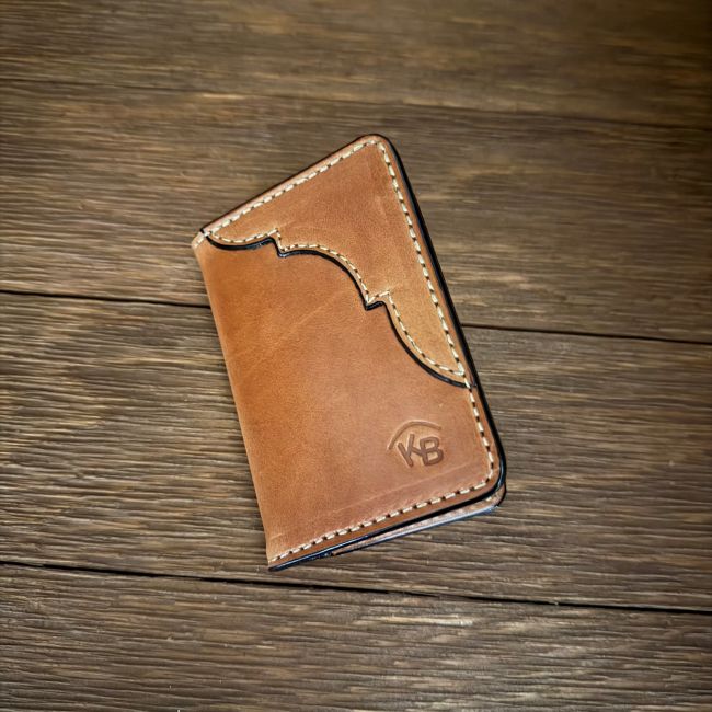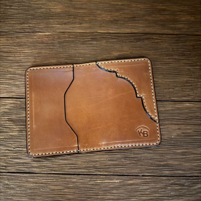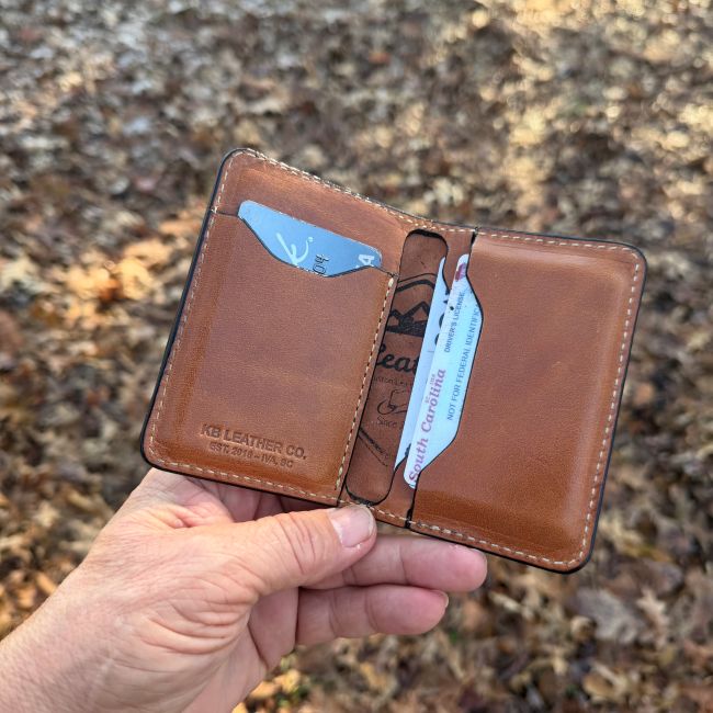 “The Tennessee” is a card wallet with four card slots on the inside and two on the outside. It will hold a lot of cards. Bills will have to be folded in this wallet and this wallet fits comfortably in the front pocket or the back. It measures 4.5 x 3.